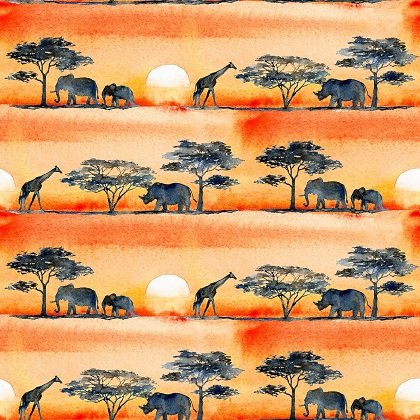 "Into the Wild" by John Keeling is a 7-piece digitally printed collection that features the wonderment and vibrancy of the African safari. The focal piece from this offering is a panel that highlights the most iconic & majestic animals found there. Within this collection you will also find geometrics inspired by African baskets, a distressed world map with animal and landscape silhouettes, an allover animal print, as well as a linear design that portrays the beauty of sunrise on the safari.