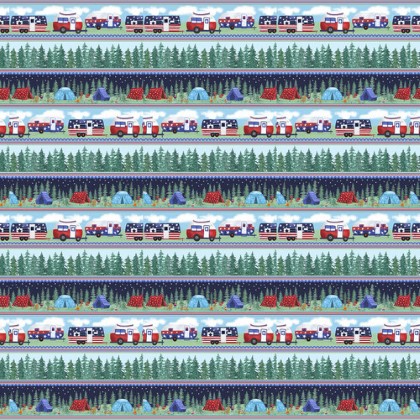 Enjoy the wilderness with Bentpath Studios’ new 12-piece collection Camp USA. This rustic collection features a 24-inch panel and a stripe displaying tents, pine trees and camping trailers. Bring in the great outdoors with patterns of camping scenes, stars, barbecue grills, tents and lanterns. This camping collection has a color palette of red, navy, green, and white.