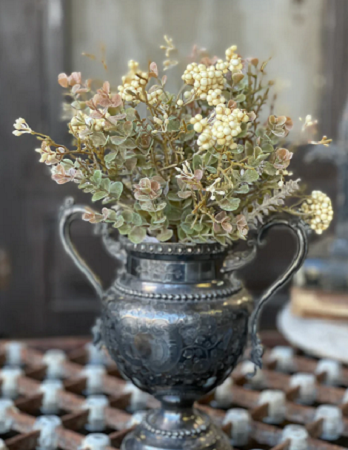 Charming clusters of berries and seed heads top attractive cool-toned mixed greenery with lavender like spires.