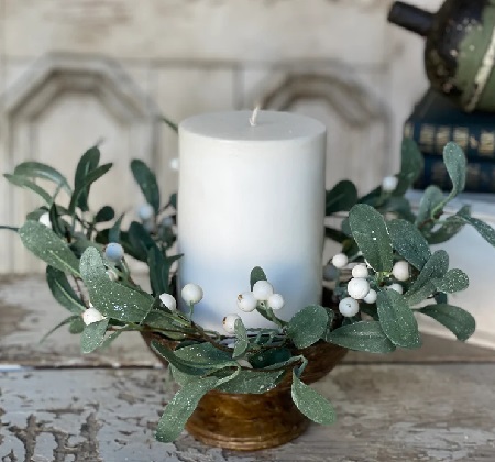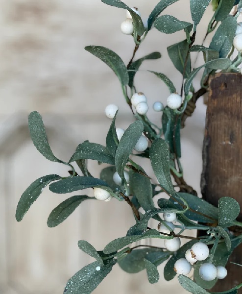 A beautiful pairing of rounded, cool-toned leaves and sprigs of white berries. Dusted with ultra-fine snow, glitter and mica..