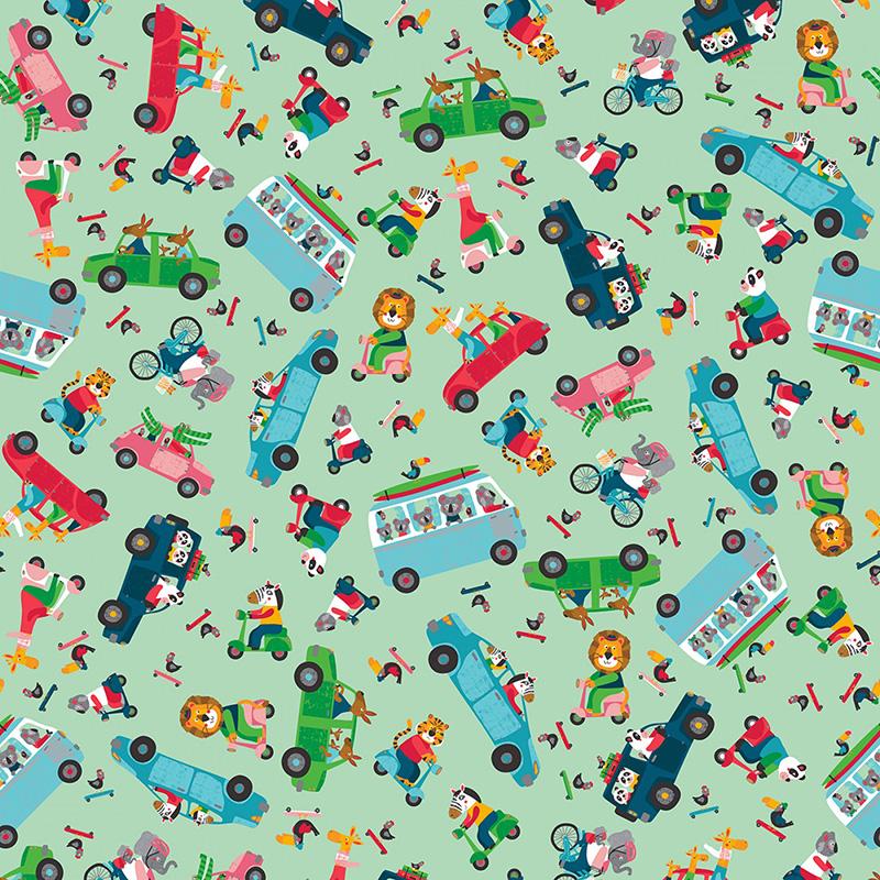 Fly through the sky or experience traffic jams in this fun collection by Liza Lewis. The bright colors and busy animals make this a charming collection. Also featured is a book panel and a scenic panel.