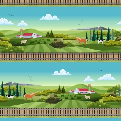 Unleash your creativity with the "Let's Go!" fabric collection by Clothworks, featuring a variety of designs including trains, construction vehicles, farm animals, signs, and words.