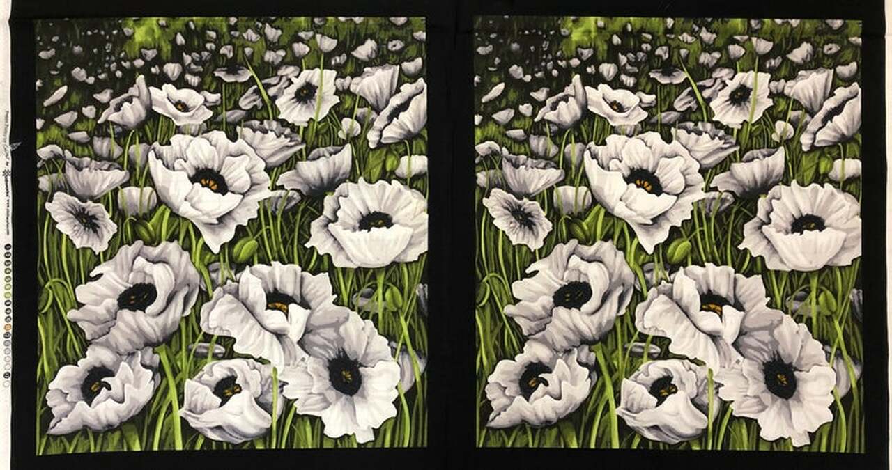 Clothworks - Poppy Poetry - 24" Large White Poppies Panel, Black