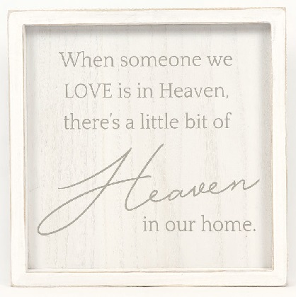 Keep the one you love close to you in spirit and thought by purchasing this Adams & Co. wood framed sign and displaying a message, "When someone we LOVE is in Heaven, there's a little bit of Heaven in our home". A word that is filled with thoughts and memories of someone you love dearly.
