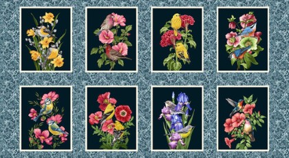 Garden Symphony is the perfect way to ring in springtime. This collection of songbirds and flowers will fill your senses with the perfume of the season. Lifelike songbirds and flowers come alive in brightly saturated hues. This collection will have you wanting to pluck the daffodils, hibiscuses, irises and other flowers out from the patterns. These lush flowers are complimented with a selection of decorative designs colored in a palette of neutral taupe and slate blue tones. Awaken your creativity by using the panel or blocks to get started on various home décor projects. Create an apron worthy of a splendid host and use the collage pattern to make placemats.