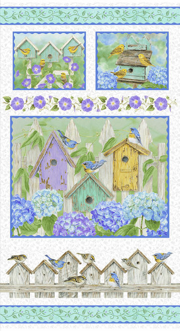 Henry Glass - Hydrangea Birdsong - 24"x 44" Panel, Blue