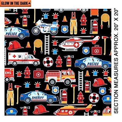 This collection is a great way to honor first responders! These prints represent policemen and policewomen, firefighters, paramedics and EMTs, all those special people who really DO save the day. An added bonus: This fabric is enhanced with Glow in the Dark!