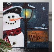 READS; WARM WINTER WELCOME. This adorable snowman lighted canvas is lit from behind with flickering amber LED lights, giving it a warm, candlelit glow. Requires two AA Batteries (not included). On/Off switch is located on side for easy access. Use the slits at the top of the back of the canvas to hang flush against the wall.