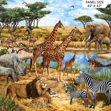 43"x 43" digital panel of Savanna animals gathered around a water hole. Designed by Linda Ludovico; Savanna is a stunning picture of the African savanna wildlife! Lions, zebra, giraffe and more are roaming across the plains and gathered around the watering hole!