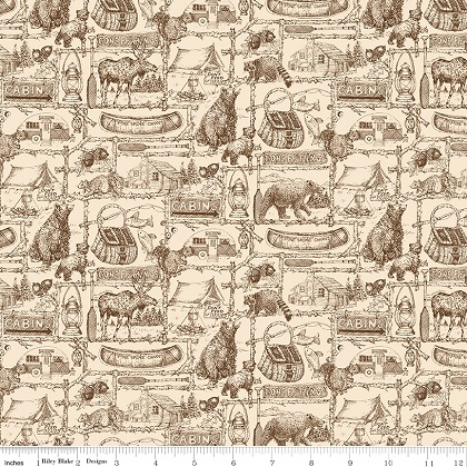 Pine Grove by the RBD Designers for Riley Blake Designs is great for quilting, apparel and home décor. This print features outdoor-themed text and icons, such as moose, tents, bears, canoes, lanterns, cabins, racoons, and more.