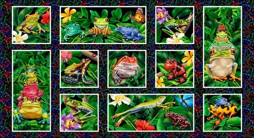 This collection, designed by Lori Anzalone, features a 24-inch frog panel, a continuous yardage block design, a frog and dragonfly allover print, a piled-up frog print, a frog and foliage design, a floral and fauna toss, a leaping frog and insect print, a tonal frog design, a small frog tossed print, a rainbow colored frog print, a patterned frog print and a reptile skin texture.