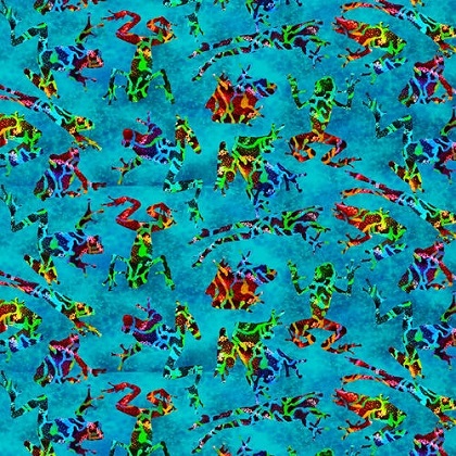 This collection, designed by Lori Anzalone, features a 24-inch frog panel, a continuous yardage block design, a frog and dragonfly allover print, a piled-up frog print, a frog and foliage design, a floral and fauna toss, a leaping frog and insect print, a tonal frog design, a small frog tossed print, a rainbow colored frog print, a patterned frog print and a reptile skin texture.