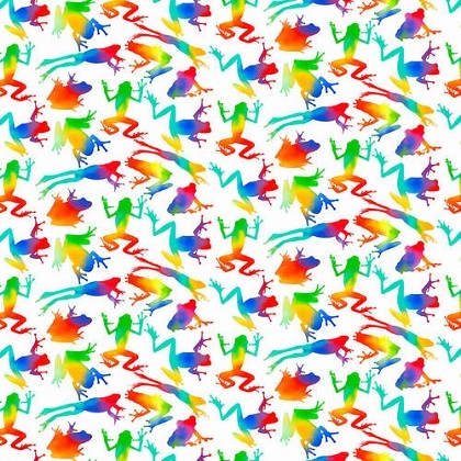 This collection, designed by Lori Anzalone, features a 24-inch frog panel, a continuous yardage block design, a frog and dragonfly allover print, a piled-up frog print, a frog and foliage design, a floral and fauna toss, a leaping frog and insect print, a tonal frog design, a small frog tossed print, a rainbow colored frog print, a patterned frog print and a reptile skin texture.