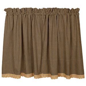 The Black Granny's Check collection is made from black and cream check fabric, with a crocheted looking lace edge and are 100% cotton. Curtains have standard rod pockets.