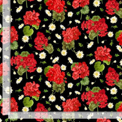 Introducing Scarlet Beauty by Timeless Treasures Fabrics, a mesmerizing quilting fabric collection that weaves together the elegance of nature and timeless artistry. This fabric is digitally printed, giving it brighter, more vibrant colors than traditional screen-printed fabrics. Create a space of beauty and elegance with this black fabric featuring large clusters of red geraniums with gold lettering, fluttering dragonflies, and ornate scrollwork.