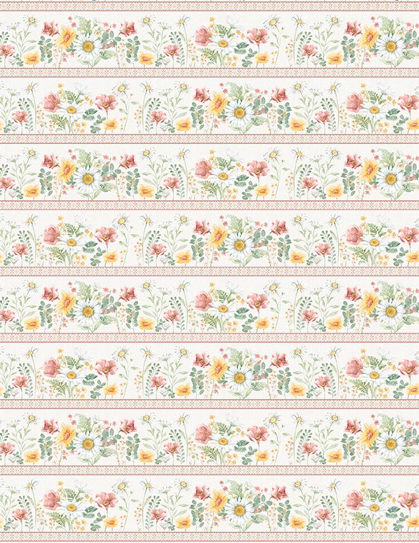 Daisy Days features a repeating stripe with 8 identical stripes, making for economical cutting/piecing when used for long borders. The colors are soft and dusty – peachy-pinks, greens, and ivory/white grounds.