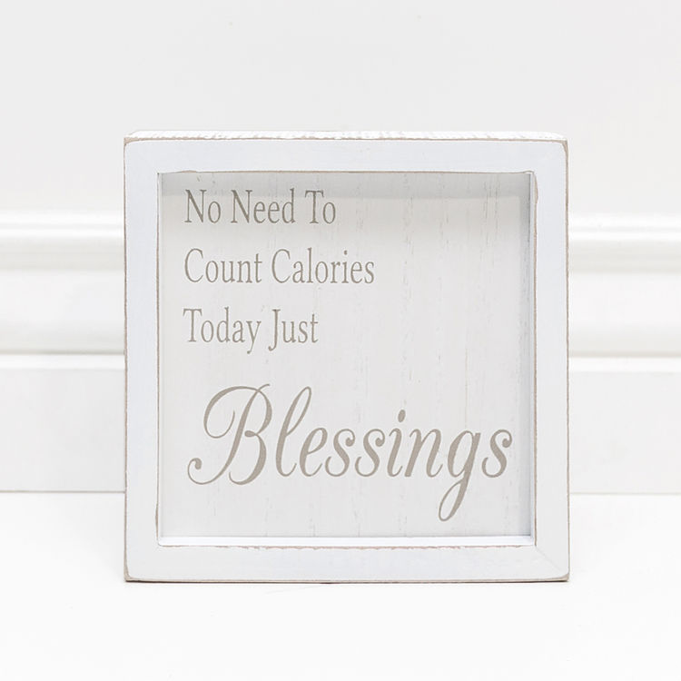Color: white and champagne. Sign reads: "No need to count calories today, just blessings."