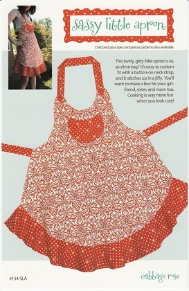 Sassy Little Apron - This wildly popular apron is so slimming to wear and girly too! It stitches up fast, and there are companion patterns in PLUS sizes and children's sizes. So fun and cute, cute, cute! Be sure to make one for your favorite friend, mom, or sister. One size, but it's easy to custom fit with the "button on" neck strap and rotary cut ties.