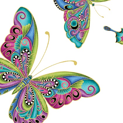 Butterfly lovers, this collection truly soars above the rest! You’ll find a traditional block panel and a variety of butterfly, floral and tonal prints in blue, turquoise, purple, lime, and fuchsia, all enhanced with metallic gold.