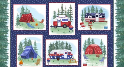 Enjoy the wilderness with Bentpath Studios’ new 12-piece collection Camp USA. This rustic collection features a 24-inch panel and a stripe displaying tents, pine trees and camping trailers. Bring in the great outdoors with patterns of camping scenes, stars, barbecue grills, tents and lanterns. This camping collection has a color palette of red, navy, green, and white.