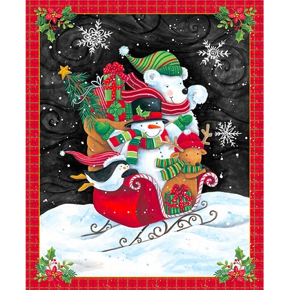 Christmas is in the air with this whimsical holiday collection featuring snowmen, penguins and reindeer. The color palette is green, red and white which is perfect for adding Christmas cheer to holiday quilts and projects. The designs include scenic snowmen, Christmas presents, gift tags, a border stripe, snowflakes and a 36-inch panel with a snowman, penguins and reindeer.