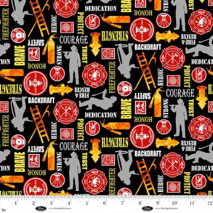 Blank Quilting - Fire Alarm - Fire Fighter Words, Black