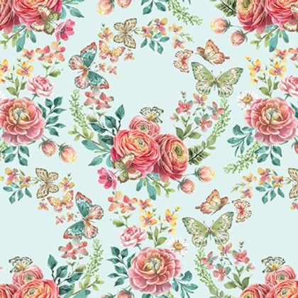 Flourish by Silas M. Studio is a new 11-piece collection. This group features a 24-inch panel with bouquets of flowers, birds perched on branches and floating butterflies. Other patterns include a border stripe, wreaths, tossed birds, flowers, paisley, plaid and scroll textures. This floral collection has a color palette of soft teals, pinks, oranges and greens.