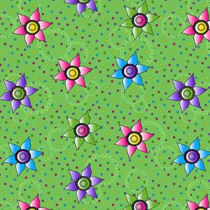Flower Power was designed by Fran Morgan of Fabric Café and known for her popular three yard quilts. The collection features 15 patterns with various brightly colored flowers, stripes, and polka dots. Using bright blue, white, pink, and green, this collection contains different combinations of gradient flowers, circles, and dots.