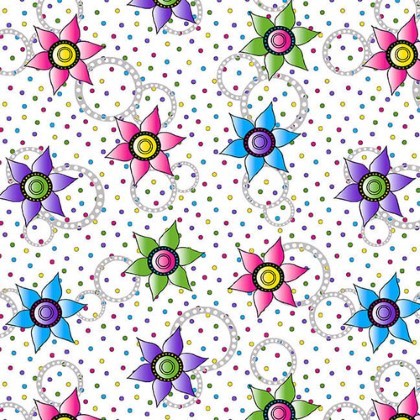 Flower Power was designed by Fran Morgan of Fabric Café and known for her popular three yard quilts. The collection features 15 patterns with various brightly colored flowers, stripes, and polka dots. Using bright blue, white, pink, and green, this collection contains different combinations of gradient flowers, circles, and dots.