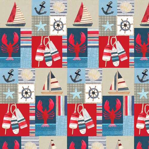 Harbor Days is designed by Color Pop Studios. This collection of nautical prints bring to mind a quaint harbor town. Colors are blues and reds. Included is a panel with a harbor scene. Companion prints have anchors, sailboats, buoys, fish, lobster and more.
