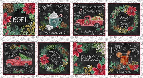 Believe in the magic of Christmas with this special holiday collection designed using a chalk board technique. The color palette is rich greens and reds making it perfect for Christmas quilts and projects. The designs include a 36-inch panel featuring a snow globe with a red truck, Christmas greenery, poinsettias, gingerbread houses and a border stripe.