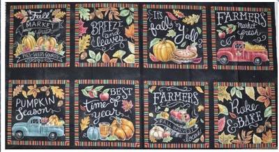 This harvest themed collection is done in a chalk and blackboard effect and designed by Lily Ford. It features a panel and blocks with different autumn sayings along with a mini pumpkin, fall leaves, acorns, farm trucks, corn and apple patterns. The projects feature a table runner and placemats.