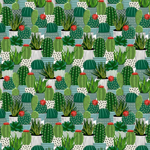 On trend with plant popularity, this collection features hanging plants, leaves and foliage, watering cans, cacti, and other designs that showcase a variety of plants in rich greens. Perfect for quilts and other projects.