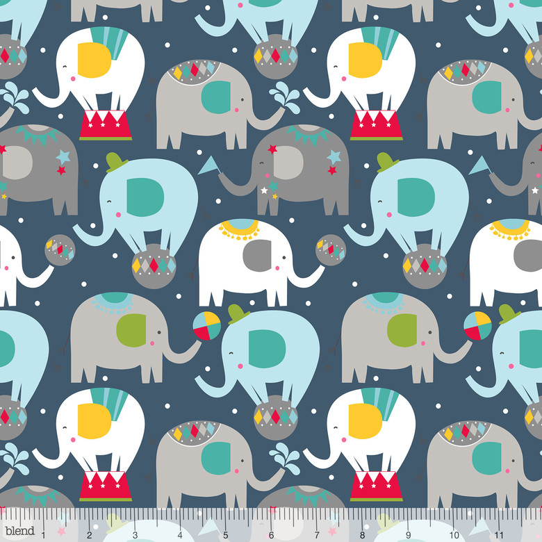 Whimsical circus print of elephants, seals and lions. Fluttering banners in multi colors, balloons and stripes. This fun collection is waiting for your next project. Great for a child's room or for anyone young at heart! Designed by Maude Asbury