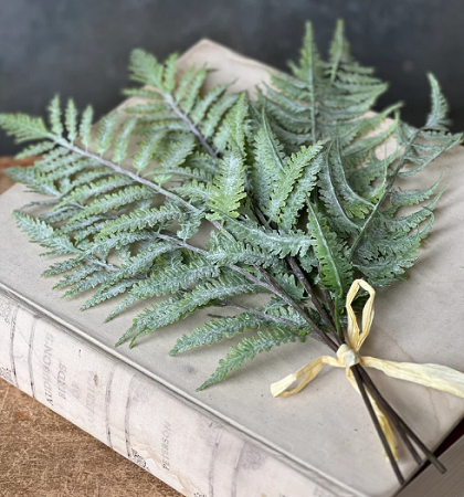 The Longacre Fern Bundles are a wonderful way to add a natural element to displays. Airy fern fronds are bound with a decorative raffia tie. Each bundle contains three stems. Greenery features a powdered finish.