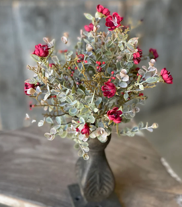 This collection features small, colorful rosettes peppered throughout a bed of mixed, lightly-powdered greenery with small berry-like orbs.