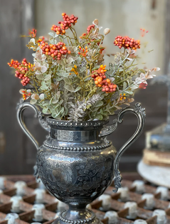 Charming clusters of berries and seed heads top attractive cool-toned mixed greenery with lavender like spires.