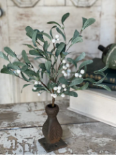 A beautiful pairing of rounded, cool-toned leaves and sprigs of white berries. Dusted with ultra-fine snow, glitter and mica..