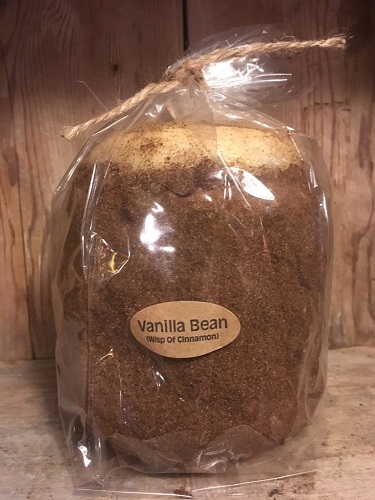 The smell of vanilla and wisps of cinnamon flow through your home when you burn this candle! Color of candle is pale yellow/cream and rolled in brown cinnamon and spices.
