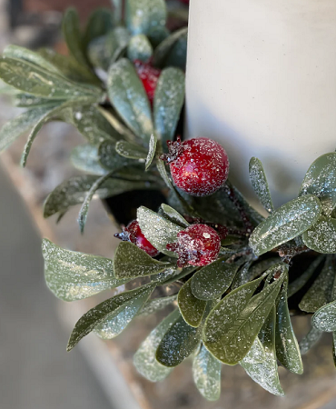 Rounded leaves in a beautiful shade of green make a gorgeous background for multi-sized red berries. Ultra fine snow and glitter add an extra dash of pizazz to this already beautiful collection.