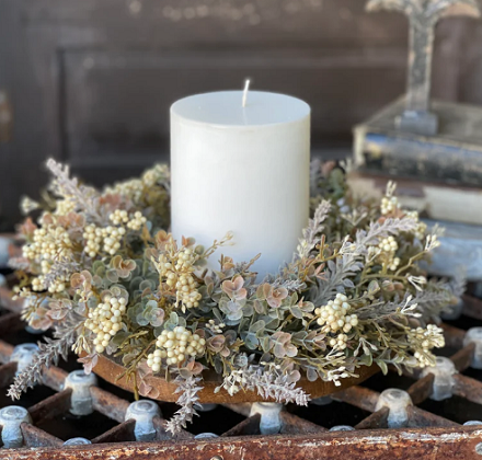 Charming clusters of berries and seed heads top attractive cool-toned mixed greenery with lavender like spires.