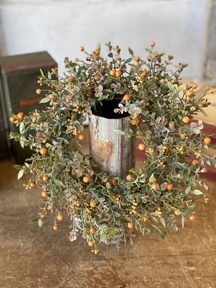 A lush bed of cool toned eucalyptus and mixed leaves makes a serene background for sprays of berries and small berry-like orbs.