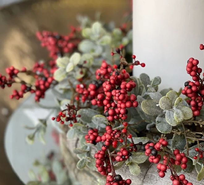A gorgeous melody of lightly flocked eucalyptus greenery dashed with branching accents topped with bubble berry clusters and small orb-like buds.
