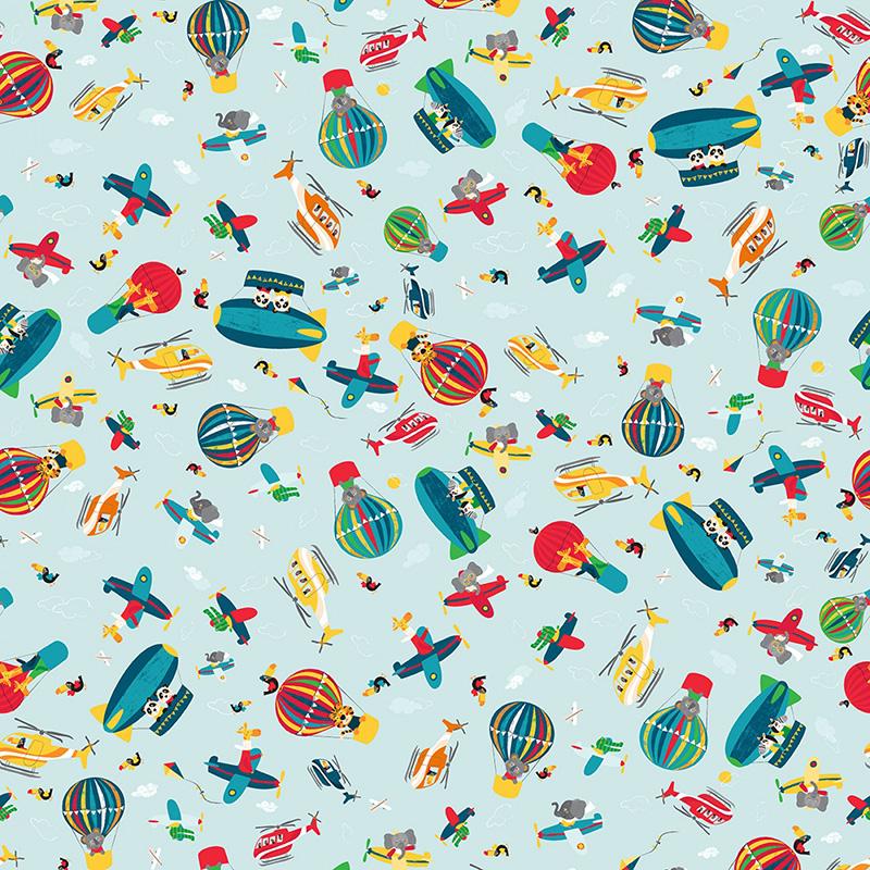 Fly through the sky or experience traffic jams in this fun collection by Liza Lewis. The bright colors and busy animals make this a charming collection. Also featured is a book panel and a scenic panel.