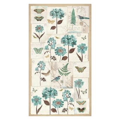Transport yourself to the enchanting world of Parisian vintage with the En Bleu fabric collection by Katie Pertiet from Clothworks. Inspired by the beauty of botanical gardens, this collection features delicate ferns, graceful butterflies, and timeless floral motifs. This fabric features a large panel of bluebirds, butterflies, flowers and drawings of leaves on antique aged paper.