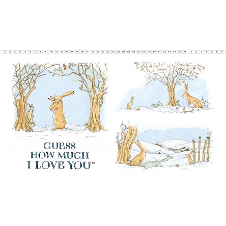 Guess How Much I Love You, designed By Anita Jeram, tells the story of how much a mother rabbit and bunny love each other in a scenic winter setting. Winter woodland scene with rabbits and birds. Colors of white, blue, brown and green cotton.