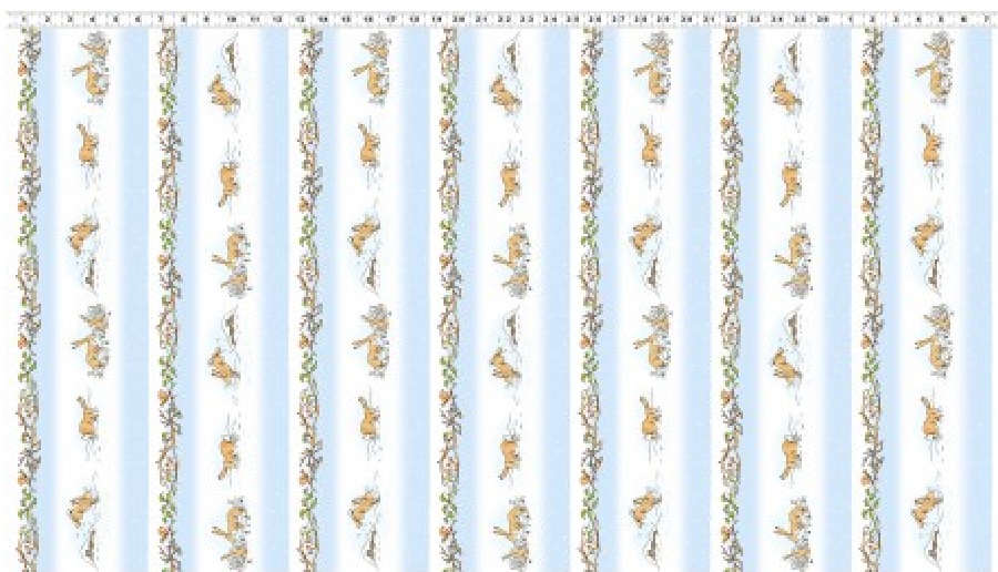 Guess How Much I Love You, designed By Anita Jeram, tells the story of how much a mother rabbit and bunny love each other in a scenic winter setting. Winter woodland scene with rabbits and birds. Colors of white, blue, brown and green cotton.