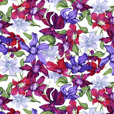 "Trellis" was designed by Cedar West and is a gorgeous collection of large Clematis flowers in brilliant colors of purple & fuchsia! This collection packs a punch of color and is perfect for floral fabric lovers! It also features a Watercolor Stripe, Diagonal Geo, and Tonal Burst in three or four different colors.