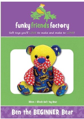 Finished Size: 30cm (12inches) from table to top of headl! This chubby baby bear was designed for new sewers. Ben is easy to sew, with no complicated arm or leg joints. He sits up on his own and has a very wide, totally FLAT, single-piece tummy - perfect for displaying images from t-shirts & baby clothes. He has a 5 inch(12½ cm) square grid on the tummy piece so you can easily center embroidery designs! His feet also have a 4 inch(10cm) square grid with LOTS of room for adding names & dates for sewing memory bears. Sewing level: BEGINNER.
