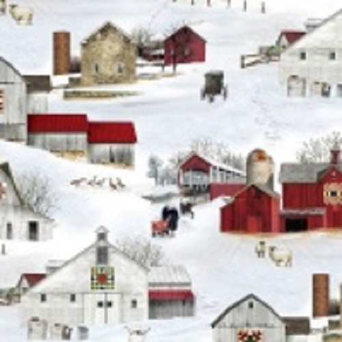 Each barn displays a unique barn quilt! Enjoy the sheep, folks, geese and snowmen scattered across the snowy barnyard.